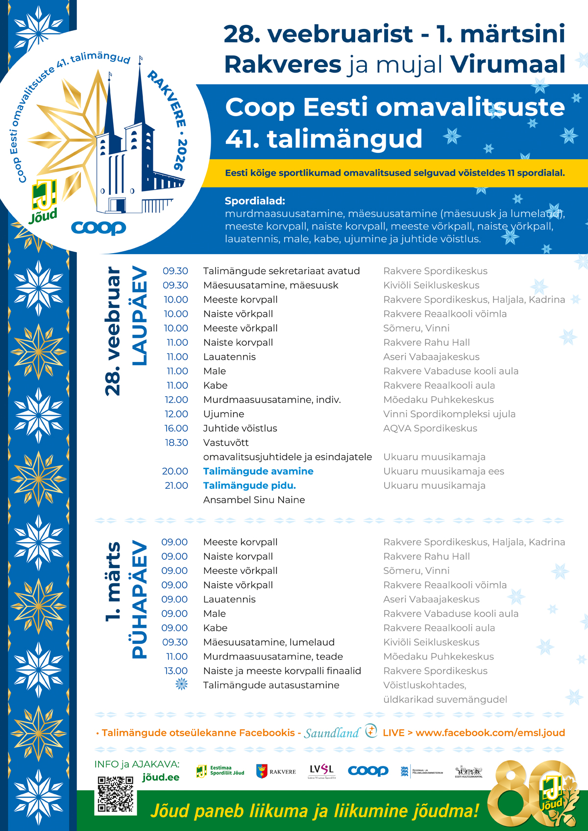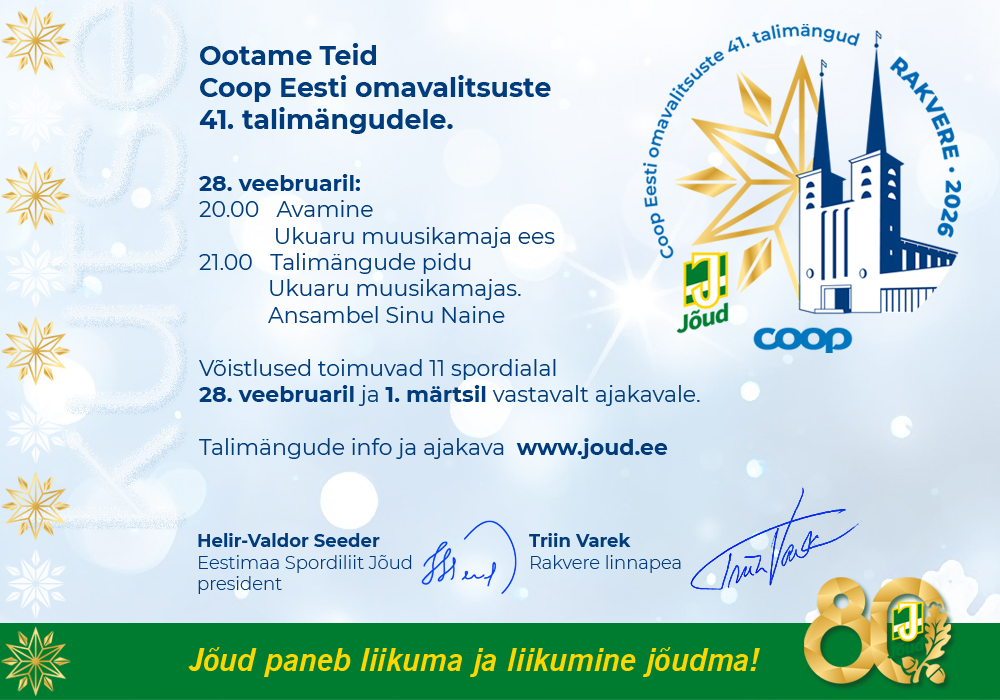 Reklaam, meedia Coop Eesti omavalitsuste 41. talimängud → Reklaam, meedia Talimängude kutse Talimängude plakat ajakavaga Talimängude otseülekannae Facebookis - Saundland LIVE → www.facebook.com/emsl.joud Korvpall ja võrkpall - valitud mängud otse Turniir.ee esilehelt.